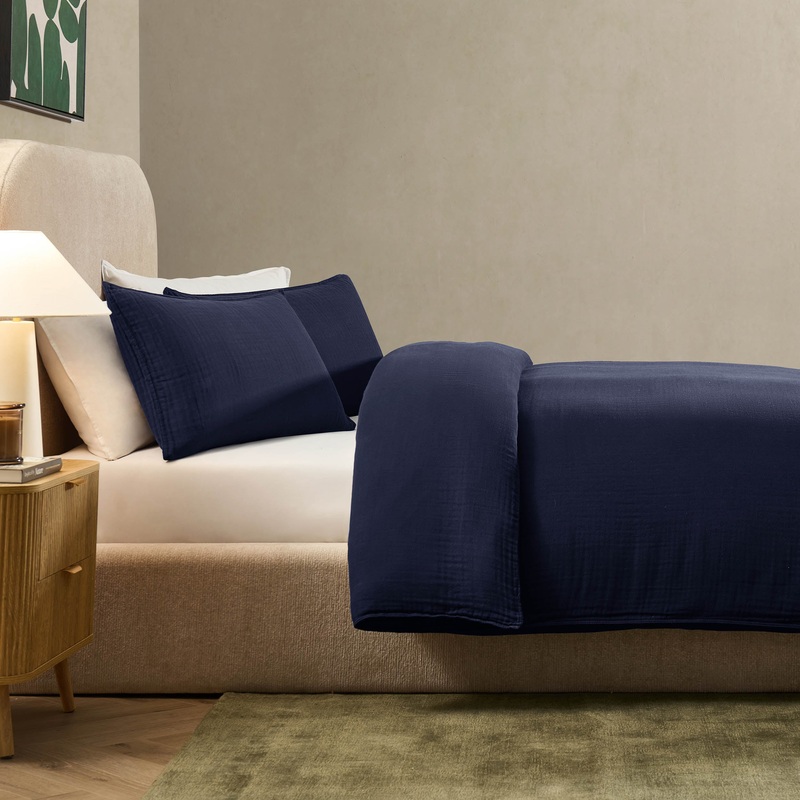 For the feeling of lightness without ever sacrificing cosy, theres the DUSK muslin duvet cover and pillowcase set in Navy.