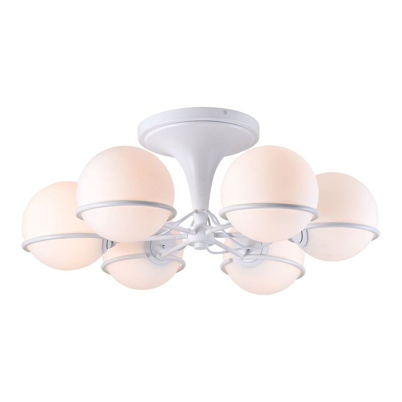 This stunning ceiling lamp will add a subtle touch of modern style to any space. This piece features glass globe shades radiating out from a metal frame. Each shade is perfectly positioned to shine light in all directions, and diffuses the light to create a glamorous glow. This light can fit perfectly into both modern and transitional spaces alike.
