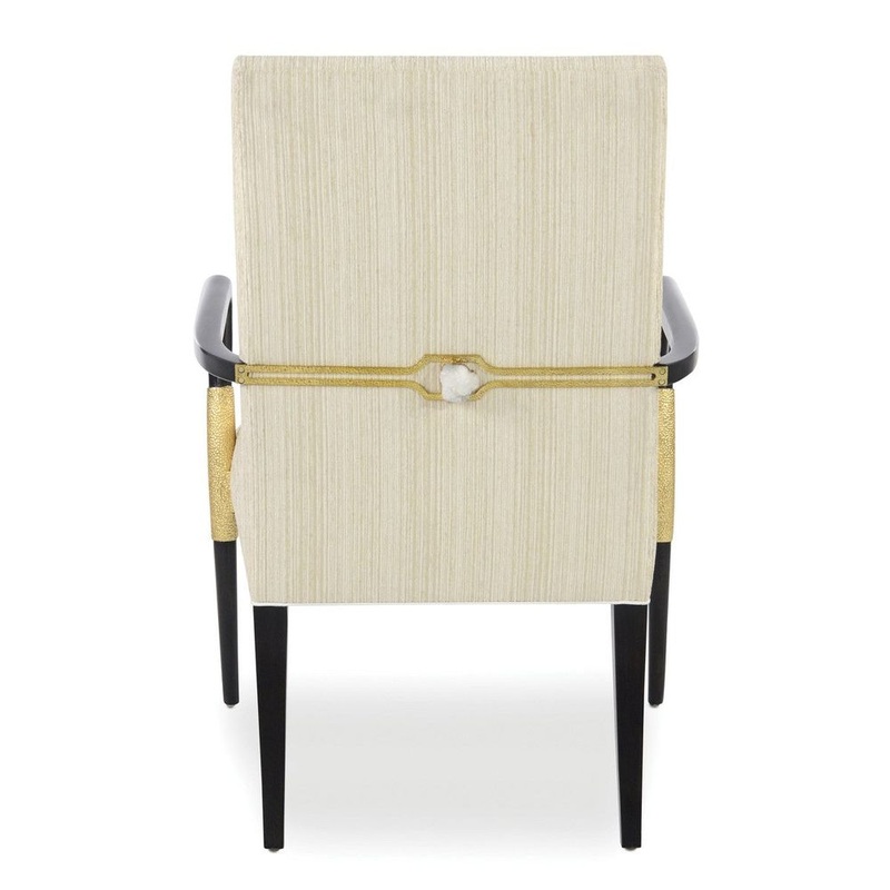 Description: 40.5″H X 27″W X 28.5″D Alcott Armchair shown in V228G Sorano Brown (with Gold) finish and 2179 fabric. An armchair has a solid wood frame in sorano brown with carved decoration on the legs in gold leaf. The upholstered seat and back are in a neutral fabric, with a decorative polished brass band to the rear finished with a white crystal geode.