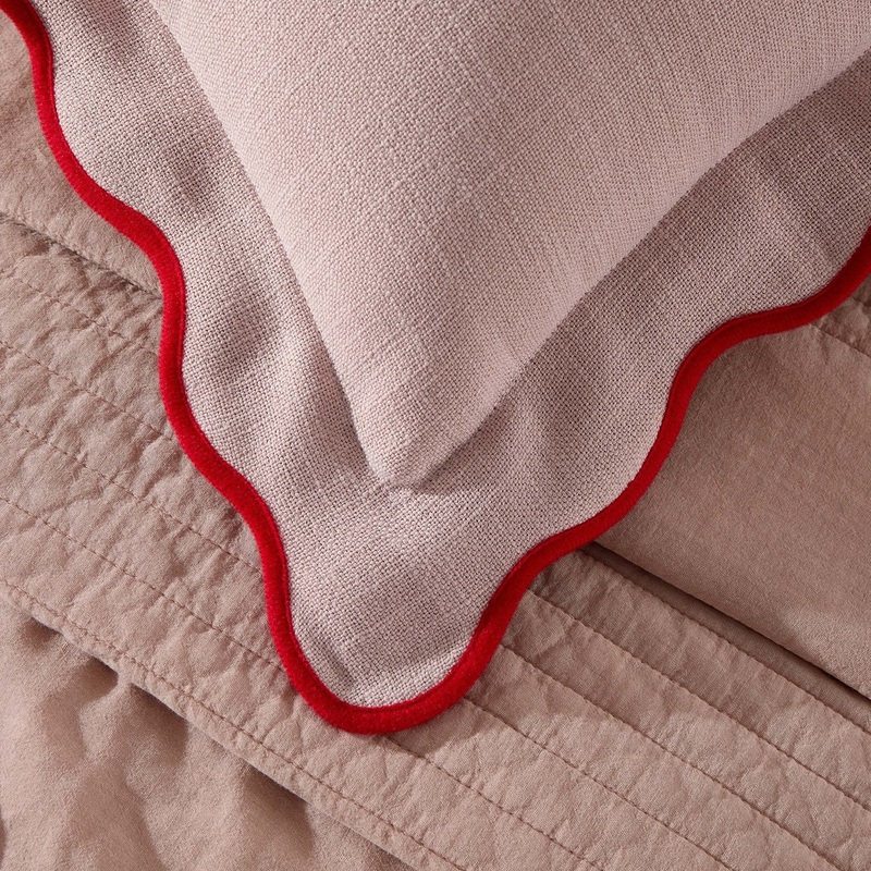 Crafted in a soft pink hue with bold red scalloped edging, this cushion cover brings effortless sophistication to any space. The delicate contrast detail adds a touch of character, making it perfect for layering on a bed or sofa.