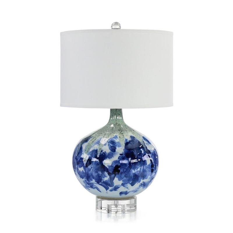 Seaside Drip Table Lampis a gorgeous design statement that instills an artistic look to any dcor. Crafted from glazed porcelain, the round body features splashes of blue and white overlain with a cascade of green tones, appearing as if it is dripping down the piece. The lamp sits atop a round crystal base and features a matching ball finial. The look is completed by a white drum shade with rolled edges.