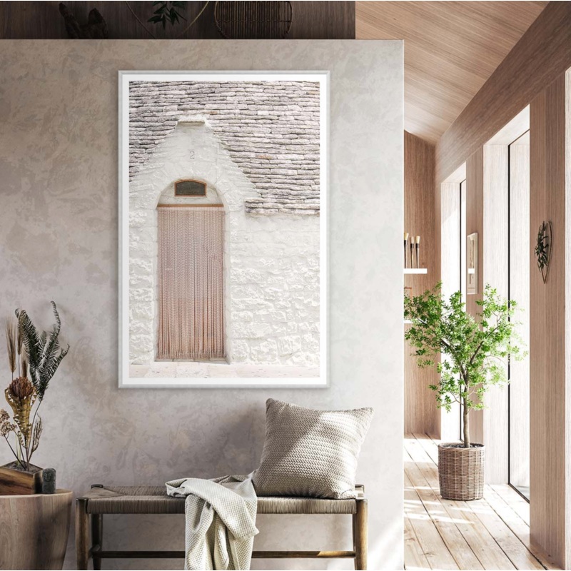 Indulge in the luxurious beauty of Secret Abode I. Photos of sun-drenched architectural details captivate, while the soothing palette of white and cream brick and stone invite relaxation. Encased in a light, striated-textured, neutral-toned moulding, this piece exudes sophistication and exclusivity. Enhance any space with this elegant addition.