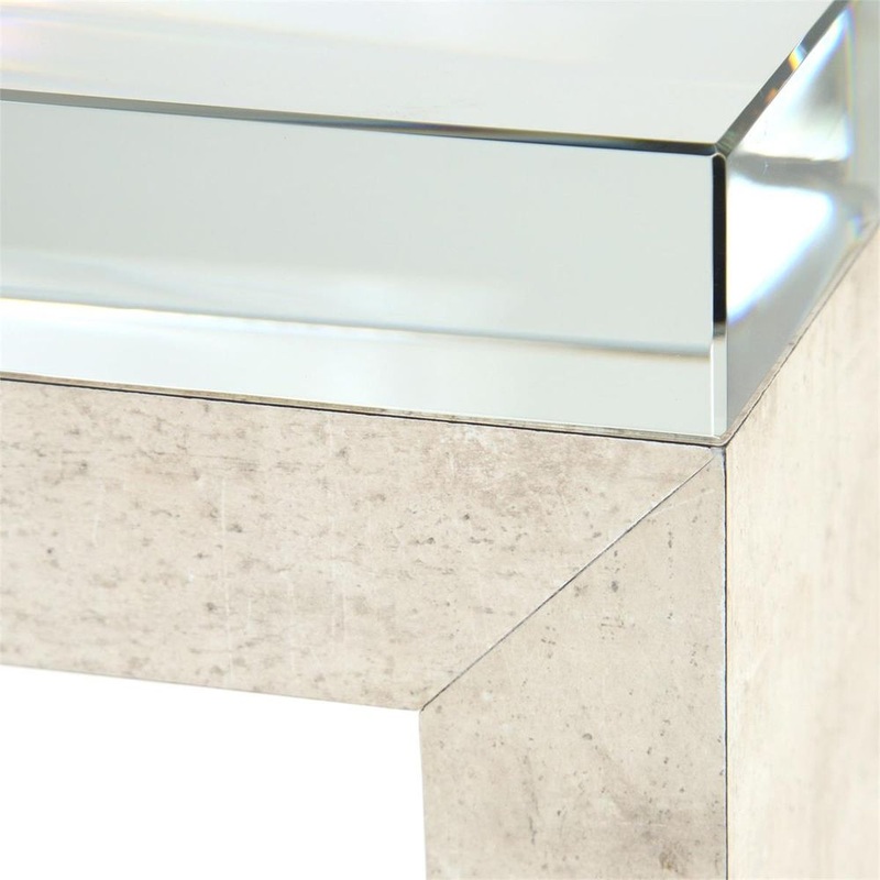 This modern end table features a base in tiza gesso and a heavy crystal glass top with a silvered bottom.