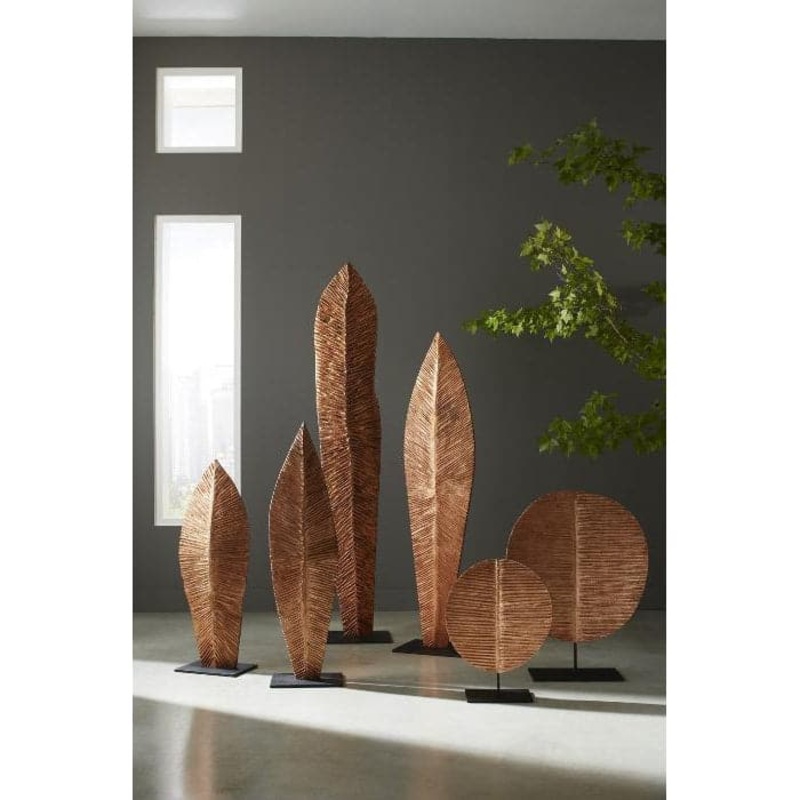 Oversized leaves available in four sizes are hand carved from wood in its natural state and finished in copper leaf. Also available in two circular versions.