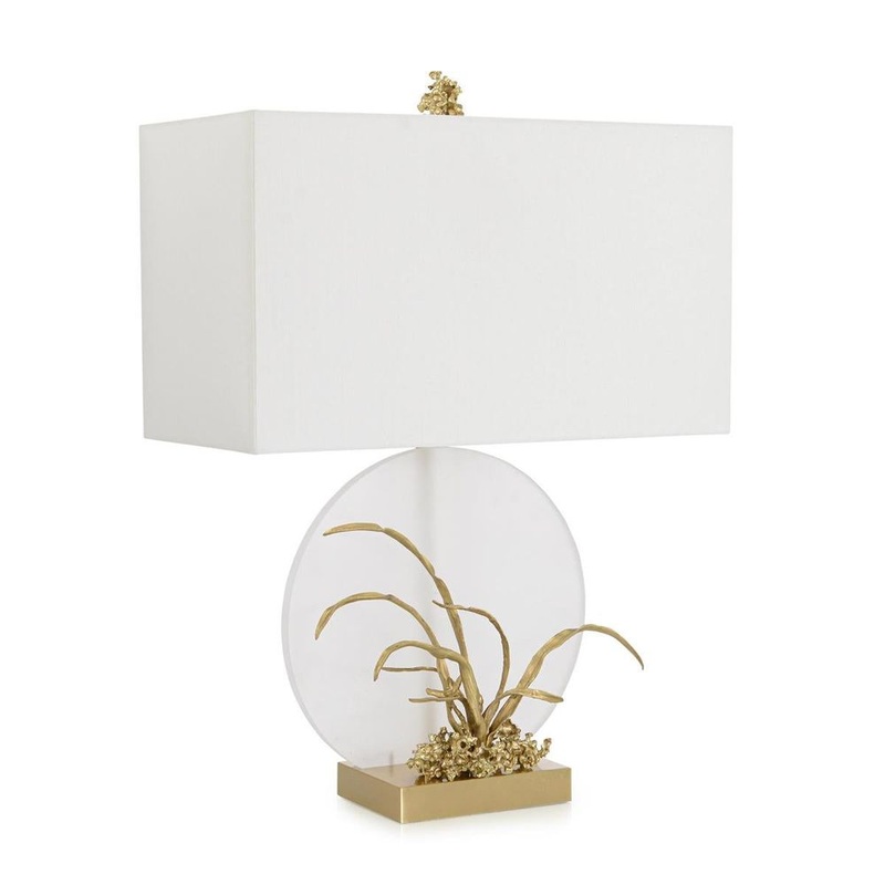 The Tranquility Table Lamp is a stunning natural motif translated through the lens of modern design. The piece showcases a gorgeous plant crafted from Polished Brass that rests in front of a rounded cut of frosted acrylic. A square brass base and matching finial with an organic shape beautifully compliment the flora to complete the look of this three-way turnkey lamp.
