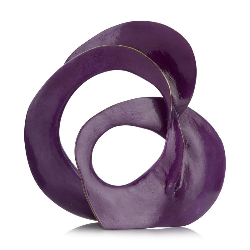 The Serpentine Flow Sculpture is a dynamic home accent that introduces a striking sense of motion to an interior space. This spiraling aluminum sculpture takes on an alluring purple tone, accented with Polished Brass trim along the sinuous edges.
