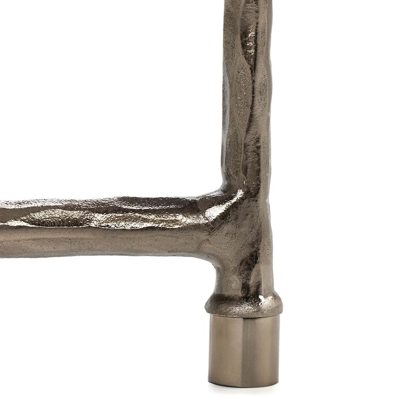 The Serrano Cocktail Table seamlessly blends natural materials and exotic tones. The slender frame is constructed with a combination of straight and curved aluminum rods in a Bronzed and Nickel finish, creating an architectural look. The surface is a rectangular cut of natural white agate stone, pairing beautifully with the dark metallic hues to complete the look.