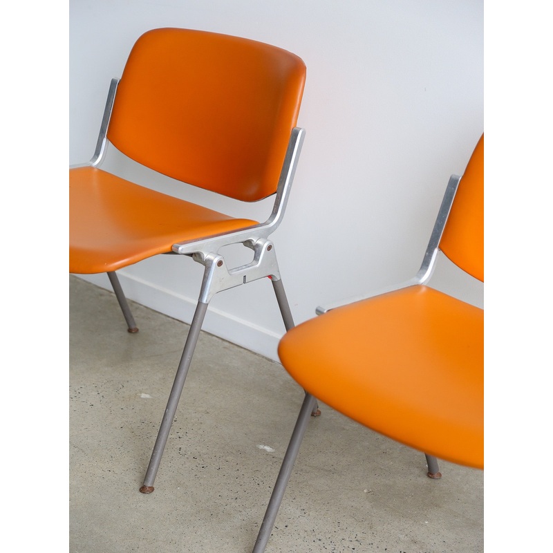 This set of two DSC 106 chairs was designed by Giancarlo Piretti for the Italian Castelli in 1965. It is one of the best-known models of the brand’s chairs and is still an object with an innovative and attractive design. The elegant interweaving of lines that define the forms of the DSC 106 has been admired by generations of architects and interior designers who have always regarded the chair not only for its timeless aesthetic quality, but also for its exceptional functionality and durability. The DSC 106 is concrete proof that Italian design is about more than just creativity, especially when it comes to being able to combine an aesthetic element with ergonomic research, efficiency and usability. This model is an example of the best collaboration between designer Giancarlo Piretti and the historic Italian brand Castelli. The structure is made of metal, seat and backrest upholstered with high-quality orange leather.