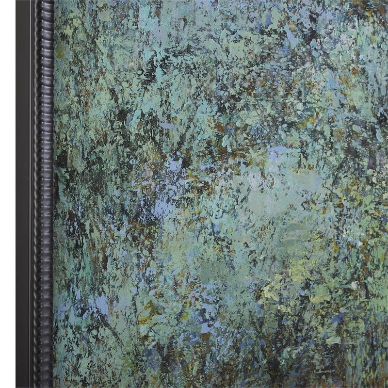 Shadows of the Sky by artist LM Zhou is a tranquil oil painting on canvas, showcasing gorgeous trees in delicate blue and light green tones. A silver sky overlooks the colorful tree line, evoking a sense of elegance and tranquility in any interior space. This breathtaking artwork is displayed within a textural black wood frame.
