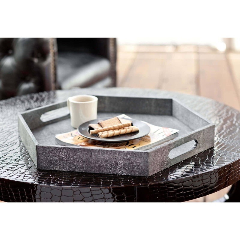 Wrapped in a charcoal faux shagreen, this hexagonal tray will meet your serving or display needs. It is also available in two other finishes.