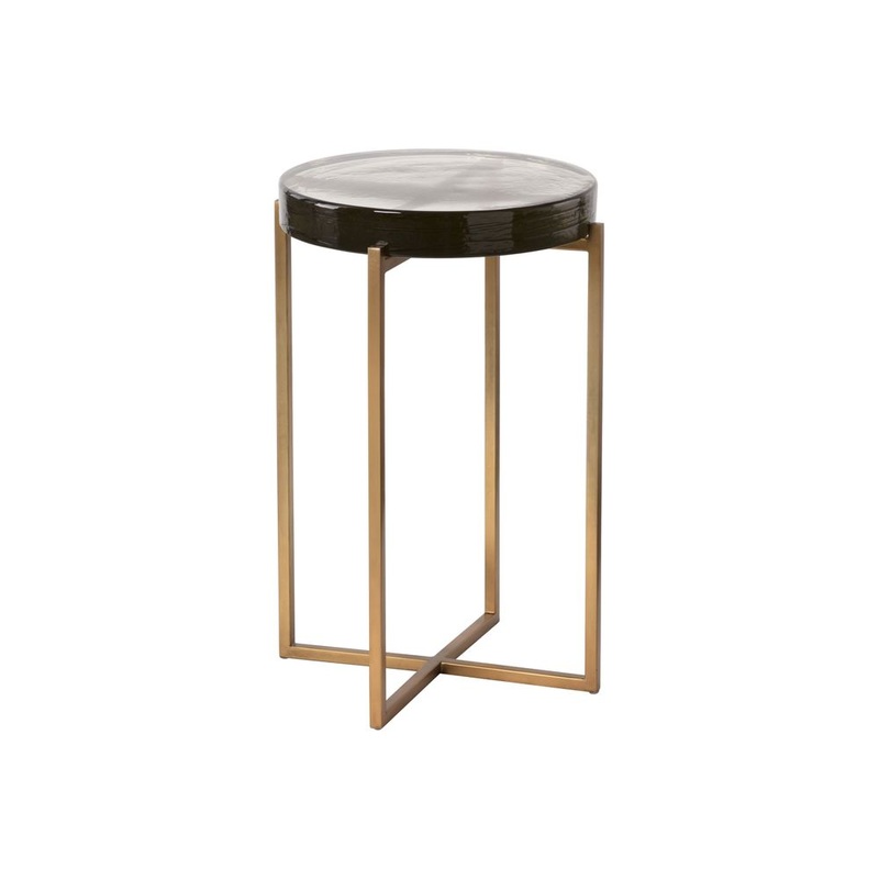 Description: The handcrafted qualities of the Sheena End Table make it incredibly distinct. The rounded table top is made from hand-poured glass, showcasing an array of captivating imperfections that arise during the cooling process. An antique brass base finishes the look.