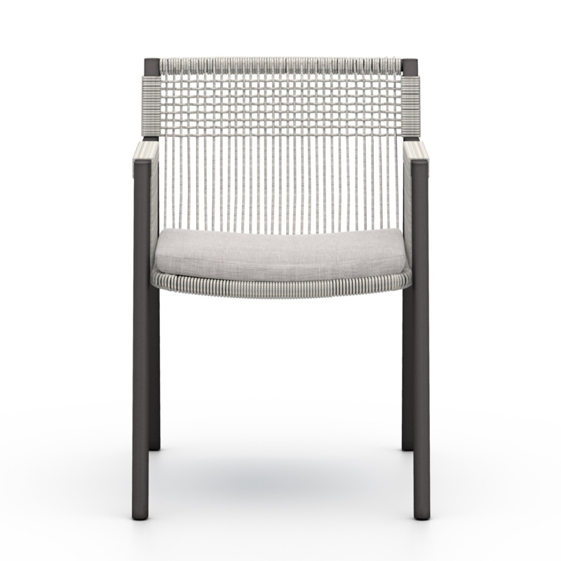 Eyecatching from every angle. Heathered rope is woven at varying widths along the back, sides and arms of this outdoor dining chair for linear detailing all around. Outdoor-friendly aluminum frame with removable seat cushion covered in UV-resistant, water-repellent fabric. Cover or store inside during inclement weather and when not in use.