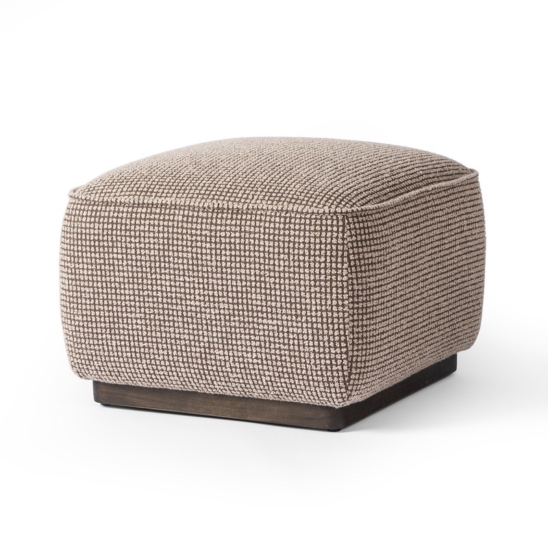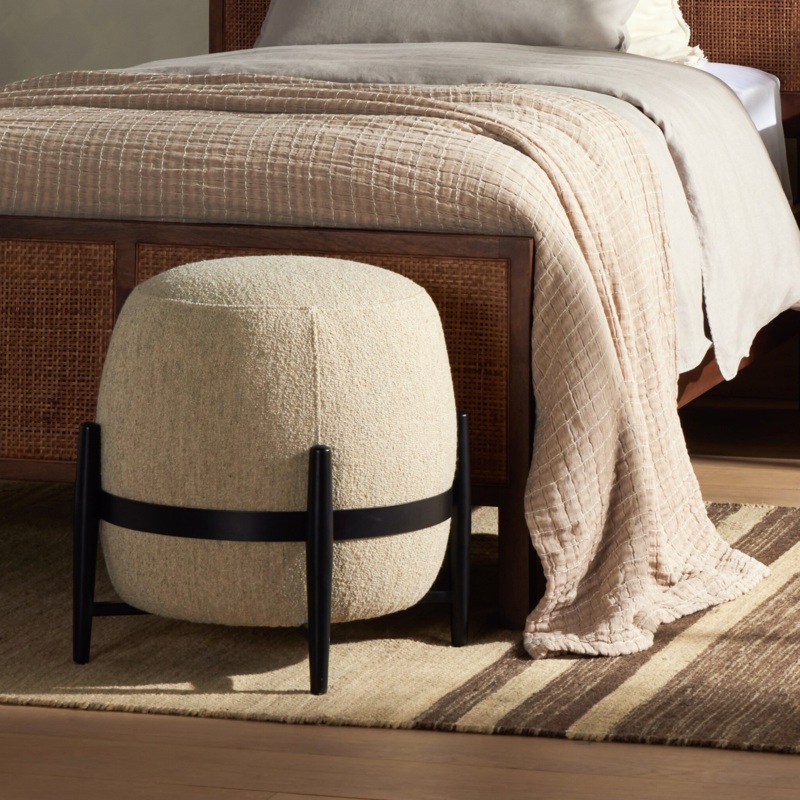 Bold shape, bold contrast. Warm taupe performance fabric in a fun, bulbous shape, accented by a black iron frame and wooden legs. Performance fabrics are specially created to withstand spills, stains, high traffic and wear, ensuring long-term comfort and unmatched durability.