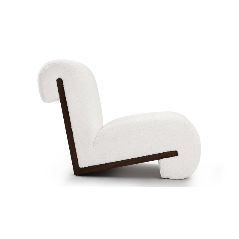 The Sienna Lounge Chair features a light-colored boucle with densely packed tufting, providing a luxuriously comfortable feel. The chair’s pale fabric contrasts beautifully with its rich, dark walnut frame, creating an elegant and sophisticated look. Its curved edges and ribbed profile, constructed from three channels of upholstered padding, offer both visual appeal and generous seating.