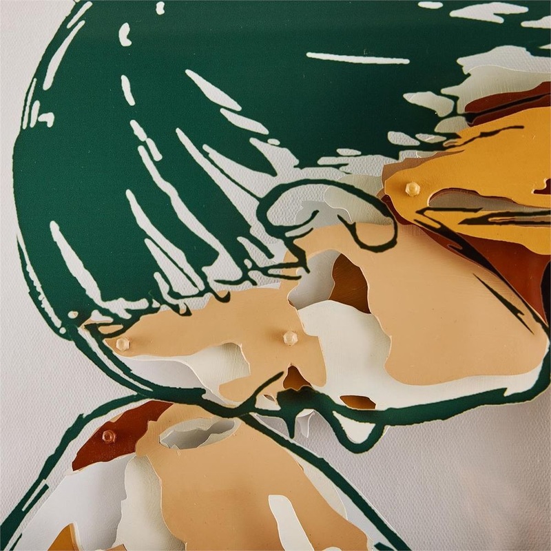 Silent Reflection by Tony Fey is a stunning work of art that depicts a human figure as they sit deeply in thought. Crafted from acrylic paint on canvas, the piece showcases a magnificent, dimensional look as small stainless0-steel rods separate the piece into tiered planes. Each plane features part of a whole, as the figure comes into full form when viewed directly from the front. This creative artwork is framed within a clear acrylic frame and may only be displayed from a horizontal orientation.
