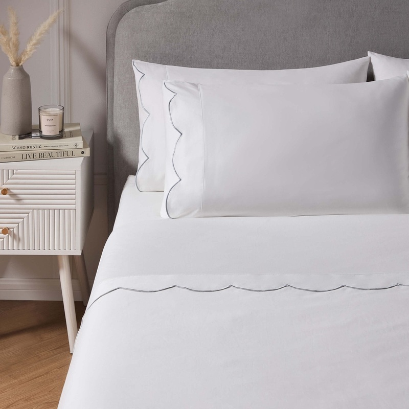 Crafted from 220 thread count cotton sateen for a soft and silky feel, this flat sheet is finished with elegant scalloped edges in black, blue, or olive. The sheet is a bedding essential that blends sophistication with comfort. Available in double, king, and super king.