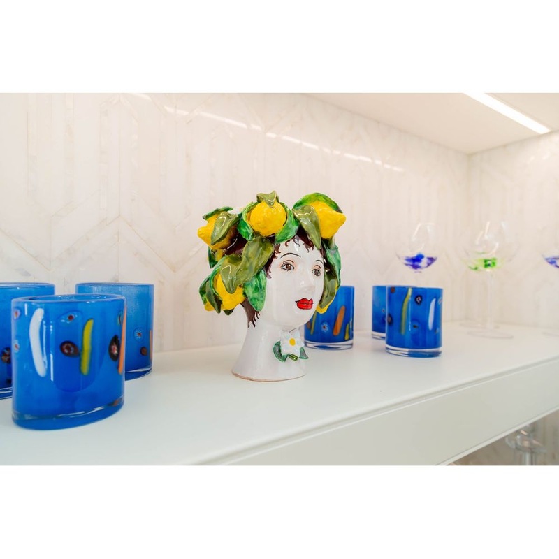 Description: The Donatello Collection is inspired by the most authentic Tuscan tradition. The collection takes its name from the very work of art: women’s heads that we wanted to elevate with both cultural and natural elements, like Tuscan plants and fruits. The vases are a sort of immersion into nature up to the point of taking up its appearances, a complete involvement between mythology and natural representation that is inspired by that unique time of Renaissance, in which women are angels and holy mothers. The collection includes 11 different hand-painted vases with lemons, peppers, persimmons, succulents, pasta, grapes, leaves, tulips, flowers, buttons, and coral. Handmade in Italy.
