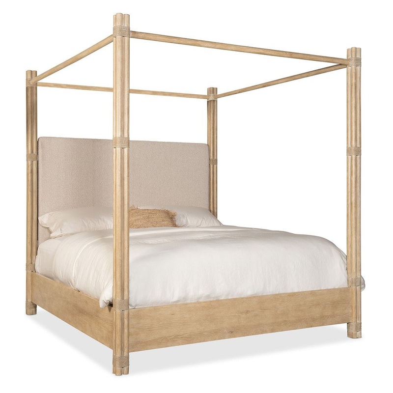 Solace Pole Rattan Cal King Upholstered Poster Bed with Canopy – Light Wood