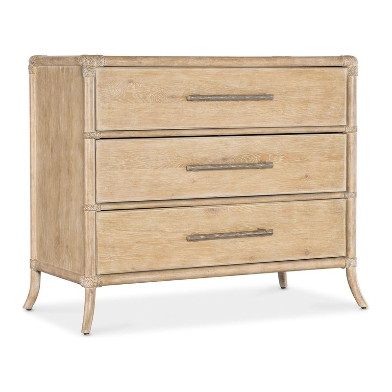 Description: Inspired by tropical getaways, the two-tone Solace Pole Rattan chest is a mixture of natural materials in a laid-back, versatile design. The two-tone finish contrasts the sand-colored Dune on the case with the Seagrass green finish on the drawer fronts, accented by textured bar pulls in a soft pewter color. The chest is crafted of Bamboo and Maple Veneers with Rope accents. Three self-closing drawers