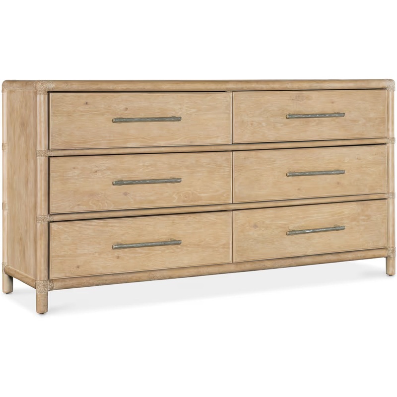 Description: Inspired by tropical getaways, the Solace Pole Rattan Dresser is a blend of natural materials in a laid-back, versatile design. Crafted of Oak and Maple Veneers with Rope accents, the dresser is finished in the sand-colored Dune, transparent by design to reveal the unique grain patterns in the wood veneer. Offering six self-closing drawers, the top left drawer has a removable felt liner and the top right drawer has a removable felt liner. The bottom two drawers are cedar-lined. The textured, pewter-colored bar pulls add a look of natural elegance.