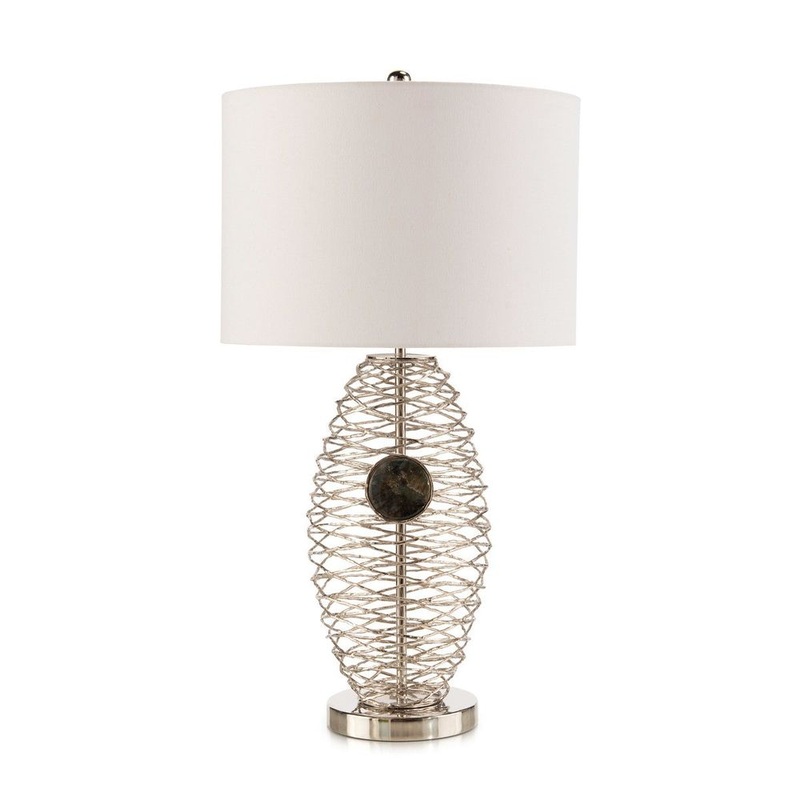 Description: A breathtaking statement piece, the Solis Table Lamp is defined by a gorgeous, winding body of brass in a polished nickel finish. At the center of the piece, a pendant of natural labradorite stone showcases stunning, multi-colored textures that communicate a wealth of depth and texture to an interior space. The piece is supported by a rounded base, matching the polished nickel body, imbuing the body in its entirety with a lustrous metallic sheen. A rounded nickel finial adorns the apex, completing the look of this gorgeous turnkey lamp.