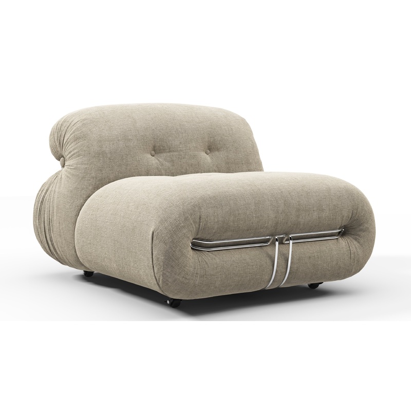 The relaxed and informal design approach of the Soriana collection reflects the 1970s’ emphasis on creating comfortable and inviting living spaces. This period witnessed a shift towards more casual and accessible interiors, encouraging a sense of freedom and self-expression within the home. Defined by its voluminous curves and clamp-like exoskeleton, the Sorianas generous upholstery wraps around its rounded form, finished with buttoning on the seat and backrest for a subtle quilted effect. Explore the full collection for matching pieces.