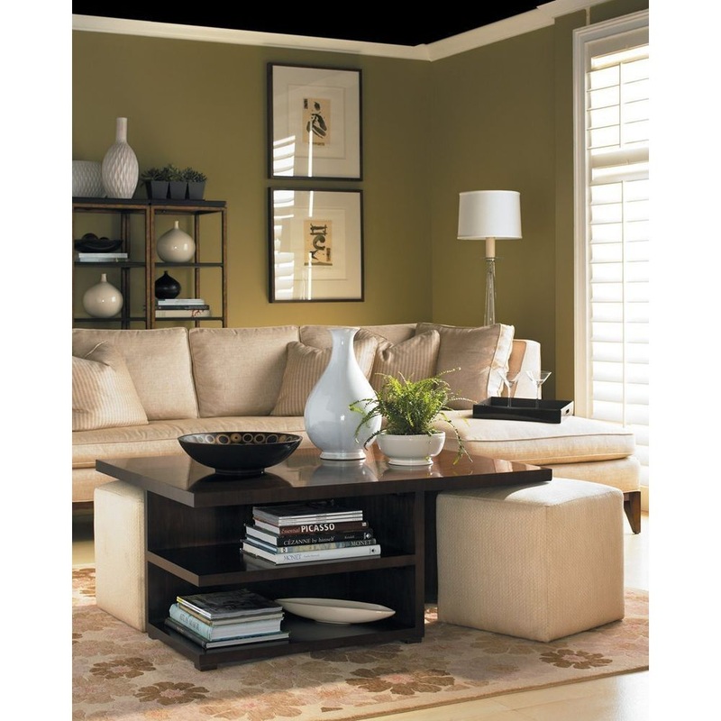 Ideal for entertaining this large surface area cocktial table provides the design opportunity to store two custom ottomans and provide lower shelving in the opposing corners.