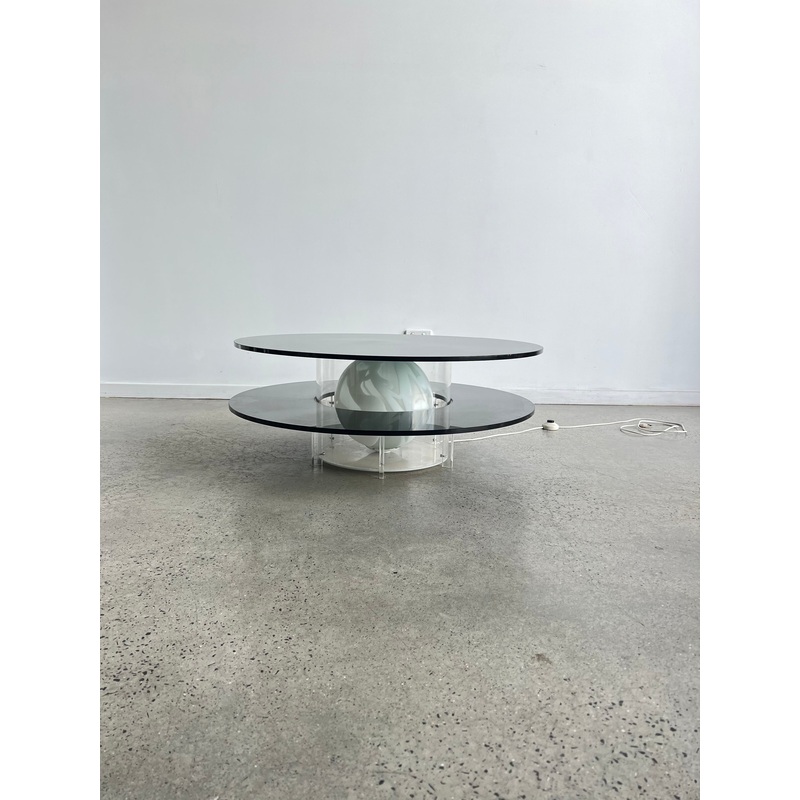 The Space Age Round Coffee Table with Smoked Glass, Plexiglass base, and inside Murano Glass Ball is a unique piece of furniture from the 1970s. The table features a round top made of smoked glass, which sits on a plexiglass base. The base has a circular cut-out in the center, which contains a Murano glass ball.