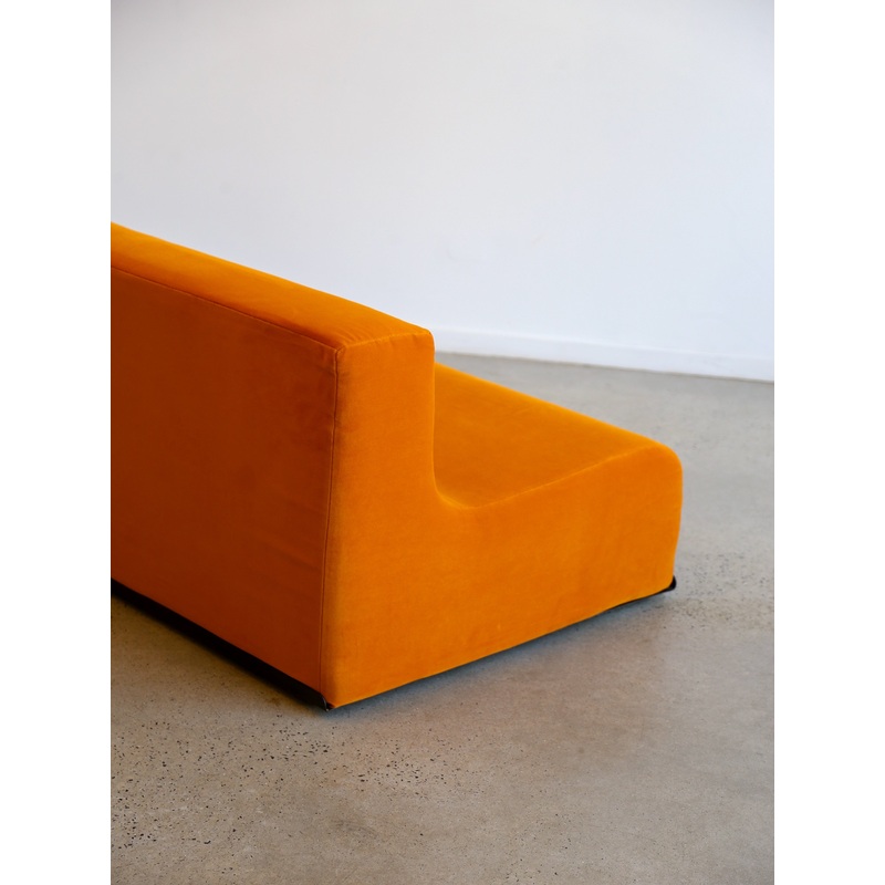 This Space Age sofa embodies the futuristic optimism of the 1960s, a period when designers reimagined interiors inspired by space exploration. Upholstered in vibrant orange velvet, the bold form is softened by smooth contours, creating a fluid silhouette. Its low profile and ABS plastic base reflect the modernist fascination with new materials and streamlined living.