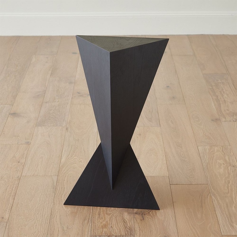 Description: The Spectrum Side Table features an intriguing abstract design in oak veneer with a blackened oak finish. This modern piece provides a stylish touch to any living space or bedroom.