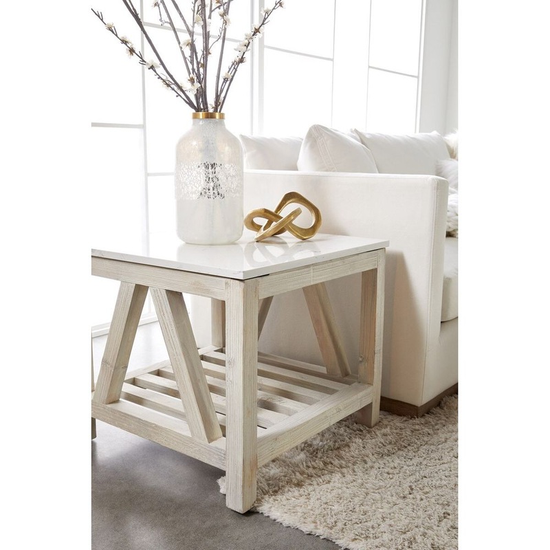 The Spruce End Table is a stunning quartz-topped table with transitional style. With a touch of farmhouse and modern design, these two opposite design styles fuse to make this gorgeous piece. It is constructed with a solid quartz top designed to resemble white and gray marble, and a solid reclaimed pine wood base with a white-wash finish. The trestle base with gray wood grain adds rustic charm to the table as well.