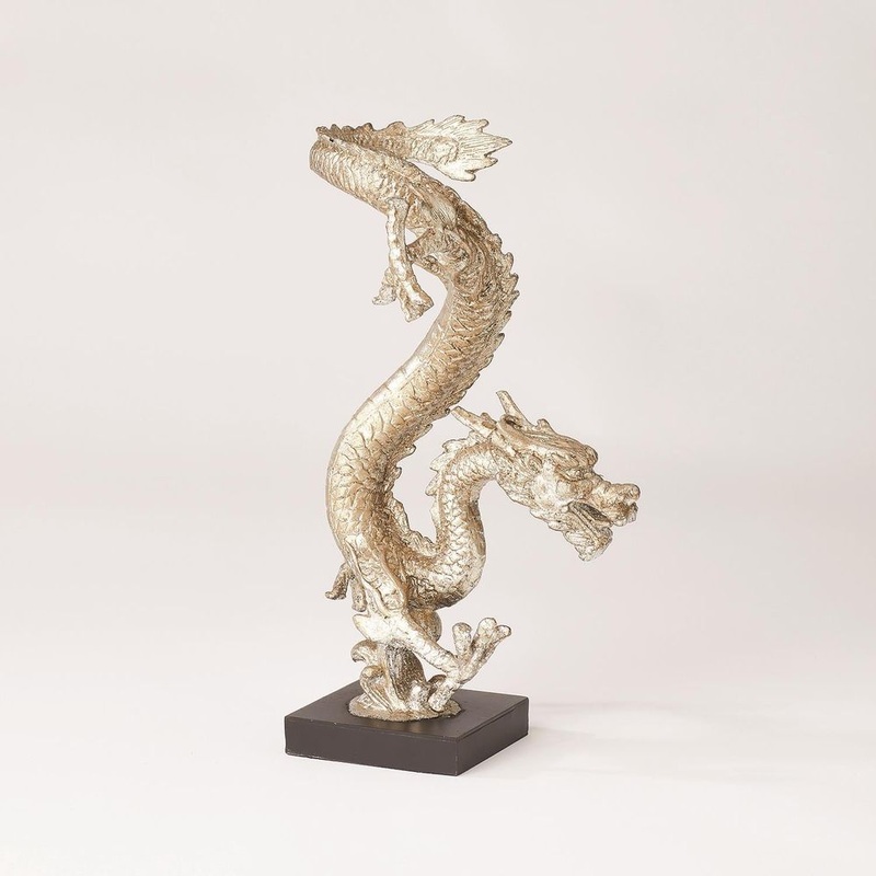 Description: Feeling Lucky? Well, when displaying our silver leaf Standing Dragon you definitely should! Based on a classic mythical good luck design, our auspicious companion is made of iron and will be a great conversational piece for any room.