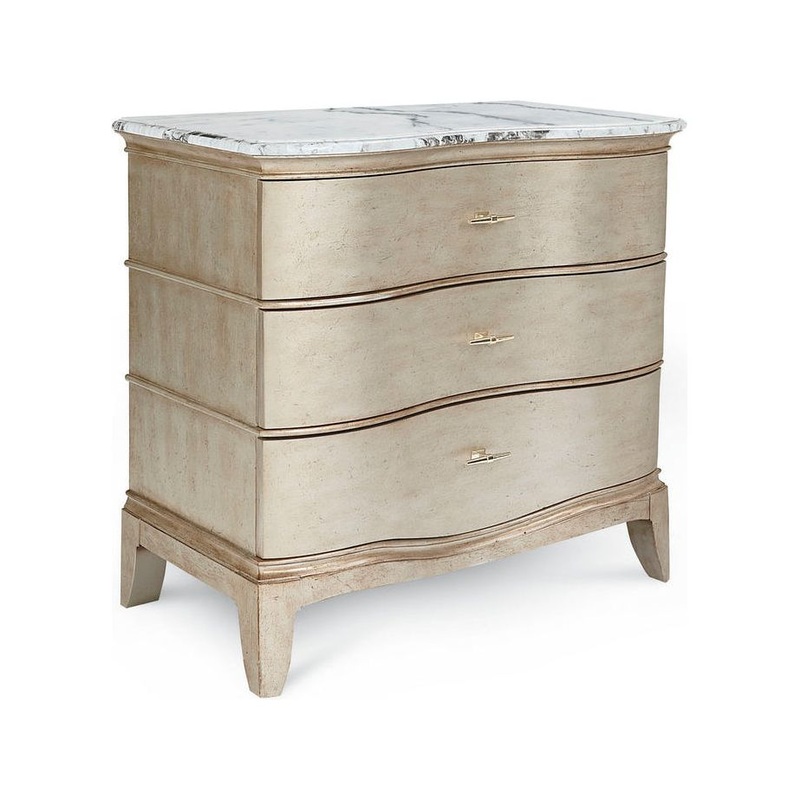 The handsome Starlite Bachelor Chest has three roomy drawers set into a gently curved serpentine front. The top of the chest is highly figurative polished stone; the body is finished with silver Bezel paint that has been glazed and gently aged for a soft sheen.