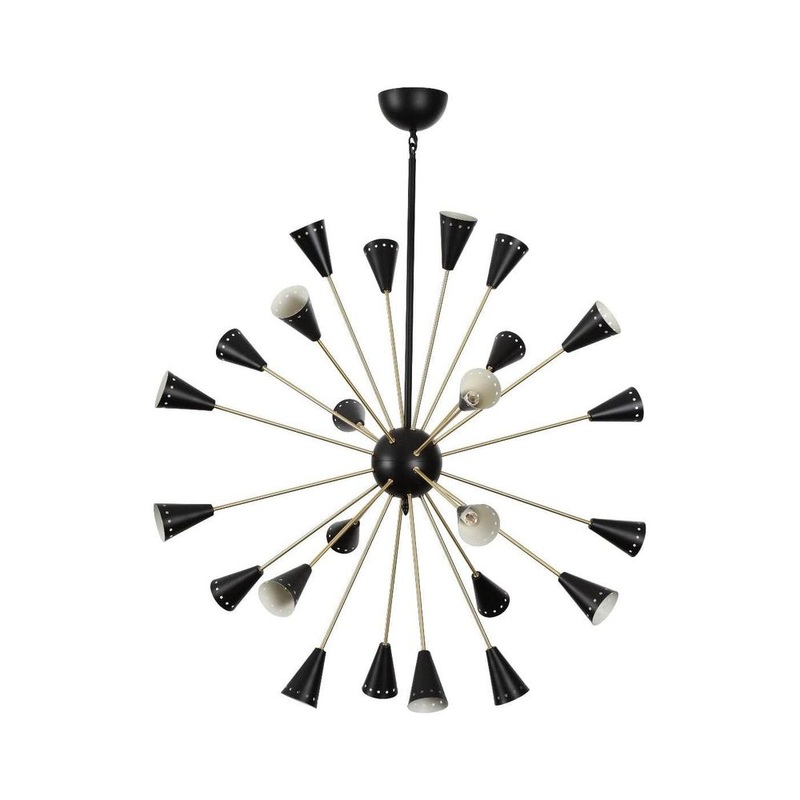 Inspired by classic mid-century modern design, this sputnik style chandelier takes things to the next level. Radiating out of a central sphere, long arms reach outward and are topped by a cone-shaped shade. Each shade has a matte black finish exterior, and white finish interior to help reflect the light from the candelabra bulb within. The matte black and brushed brass finishes create a sophisticated combination that will look great in modern and contemporary style spaces alike. With bulbs pointing in numerous directions this chandelier is ideal for ambient lighting. Available in three different sizes.