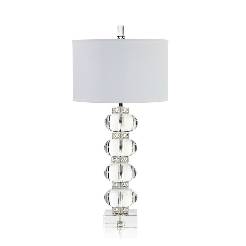 The Stunning Table Lamp is a cutting-edge design statement that instills a sophisticated look to an interior space. The ornate body features four smooth cuts of clear crystal, placed between Polished Nickel accents displaying geometric motifs. The piece sits atop a square acrylic base matched by an ornate finial. The look is completed by a white linen drum shade with rolled edges.