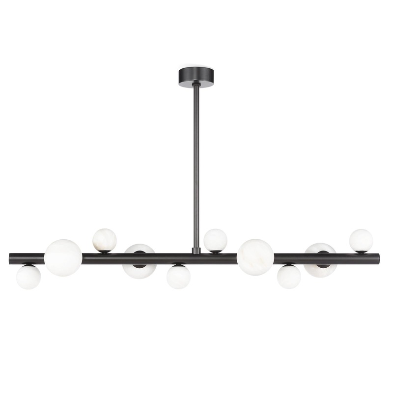 Natural alabaster stone orbs dance around a metal base, adding a spectacular sculptural element to your home. The Styx Chandelier is elegant and modern. When illuminated, it has a special ambiance that only alabaster can create. Add this chandelier to a dining room or living space deserving of a modern statement.