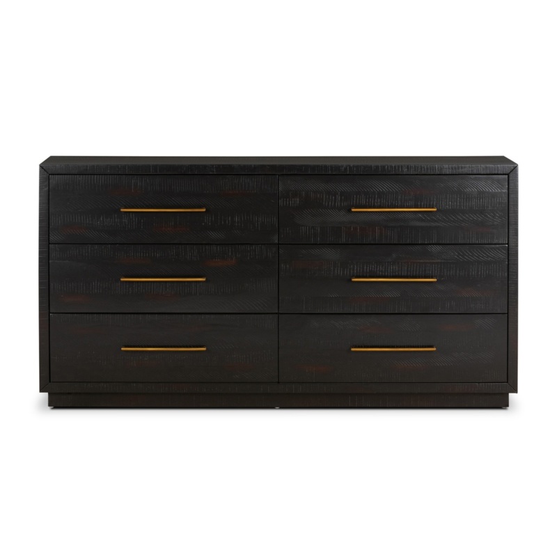 Simple sophistication with a modern edge. Clean lines lighten the natural depth of a burnished black finish. Brass-finished hardware adds a sleek touch to six spacious drawers.