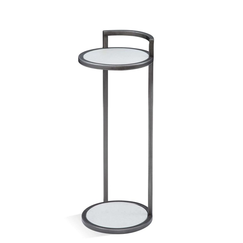 Metro modern styled martini table is perfect chair side accent. Features white marble inserts and a silver leaf frame.