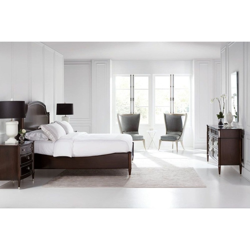 Attention-getting by nature, this exceptional chair has considerable presence. Its tall winged-back design is expertly upholstered in a luxurious satin and trimmed in a silhouetted wood frame wearing a Golden Shimmer finish. Of particular note is the extraordinary tailored finger-pleat detail along its inside lumbar. Expertly trimmed with a metal bar finished in Champagne Gold, this elegant detail matches the metal ferrules on its front legs. Inspired by the glamour of the Hollywood Regency era, this signature chair is simply magical, masterfully fresh, and refined.