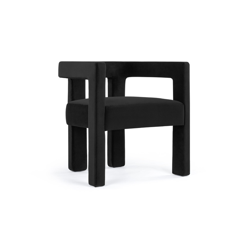 The Tala Armchair embodies contemporary Italian design with a sophisticated blend of straight and curved elements. The chair’s straight leg design contrasts elegantly with its curved backrest, offering a unique aesthetic that is both minimalistic and stylish. The chair is upholstered in sleek black fabric, exuding a modern appeal.