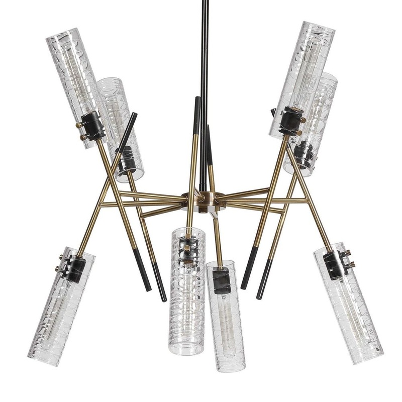 A dramatic soft contemporary look blends straight lines and linear glass to give us this eye-catching 8 Lt. pendant. Featuring a combination finish of texture black and antique brass complementing the narrow clear cylinders of glass with unique swirled thread accents. Includes 8-60 watt max Edison sockets. Supplied with 15′ wire, 3-12″ stems and 1-6″ stem for adjustable installation.