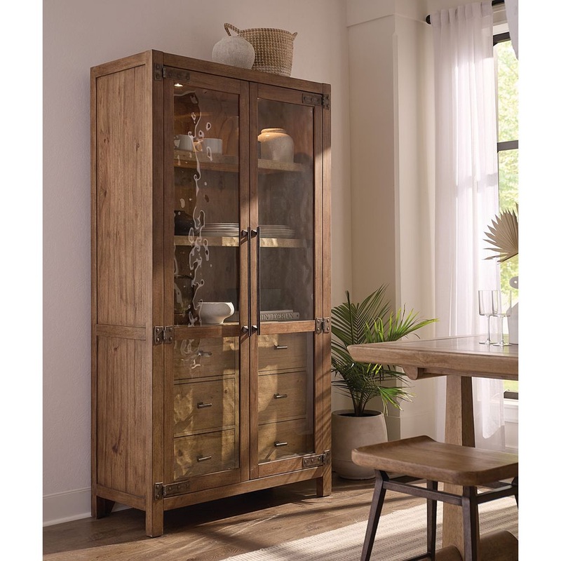 Description: Inspired by California wine country and influenced by the quaint bungalows and craftsman architecture of the region, the Terrace Row Display Cabinet is made of Pecky Hickory and White Oak Veneers with wood-framed seeded glass doors with rustic hammered metal hinge accents. The cabinet features a two- tone finish with the light-and-airy Sonoma on the inside and the robust Napa on the doors. Along with two self-closing drawers, there are two lights with a 3-intensity touch-switch located on the right middle hinge. The hammered metal bar pulls complement the metal hinges.