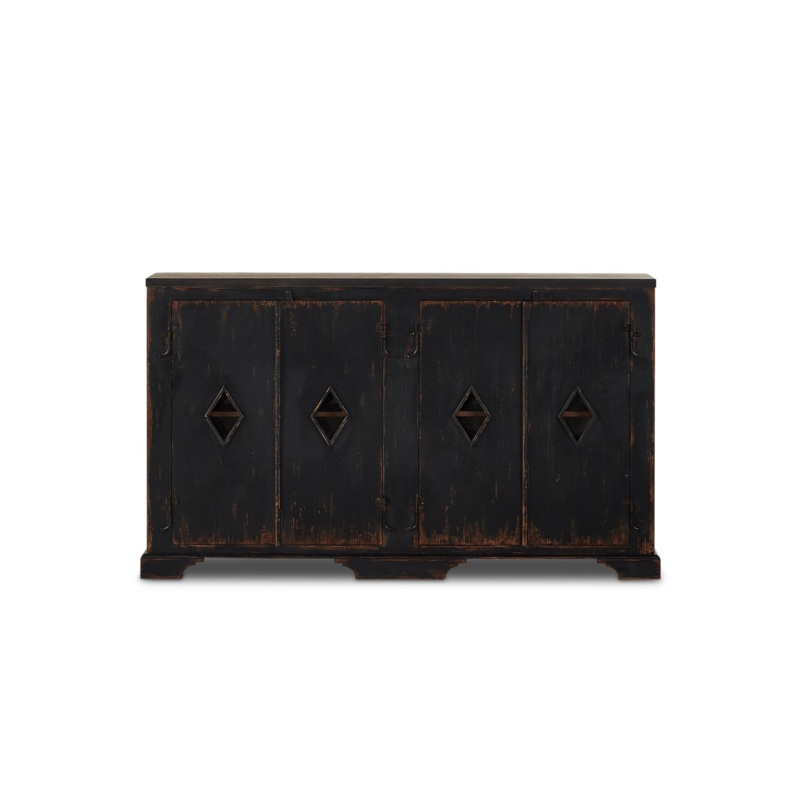 By the makers at Van Thiel, known for their antique-inspired pieces and hand-applied finishes. This wide but slim solid pine cabinet features door fronts with diamond cutout details and wire mesh inserts. Detailed with antique-inspired hardware and hinges. Metal-clad top in oil-rubbed bronze finish. A multilayered hand-applied finish gives it the look of a found piece.