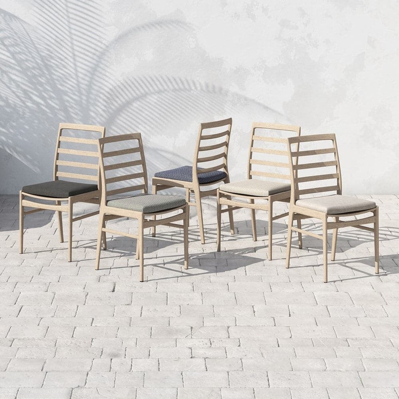 Modern materials ready stylish seating for the outdoors. Washed brown teak and an ash-colored UV-resistant Sunproof cushion refresh the classic ladderback chair. Safe for outdoor use. Cover or store indoors during inclement weather and when not in use.