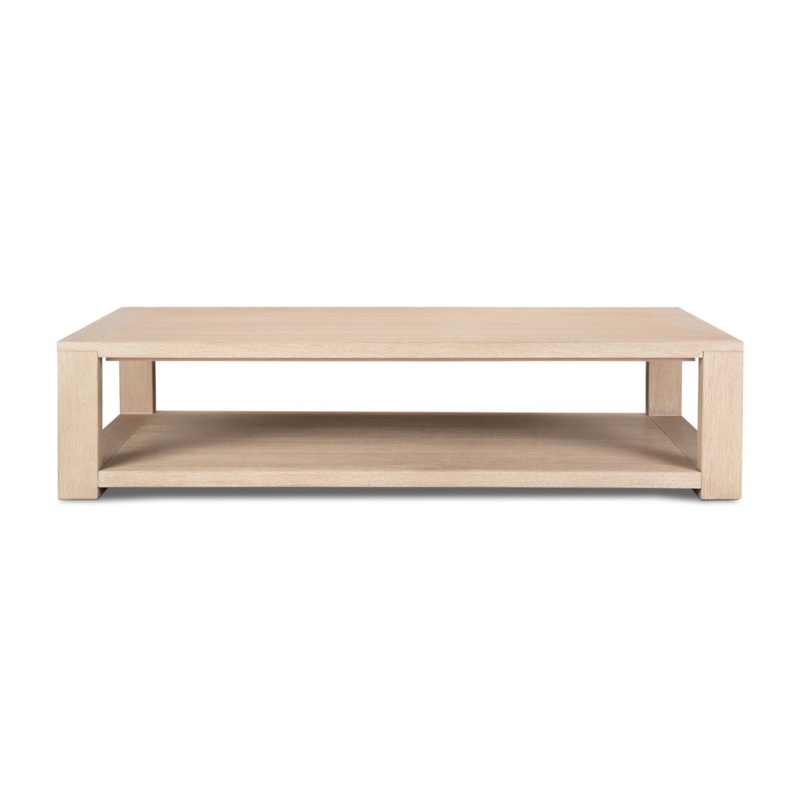 Made from bleached solid oak, a simply shaped coffee table brings a light, clean look to your living room. Lower shelving brings bonus storage and display of favorite books and more.