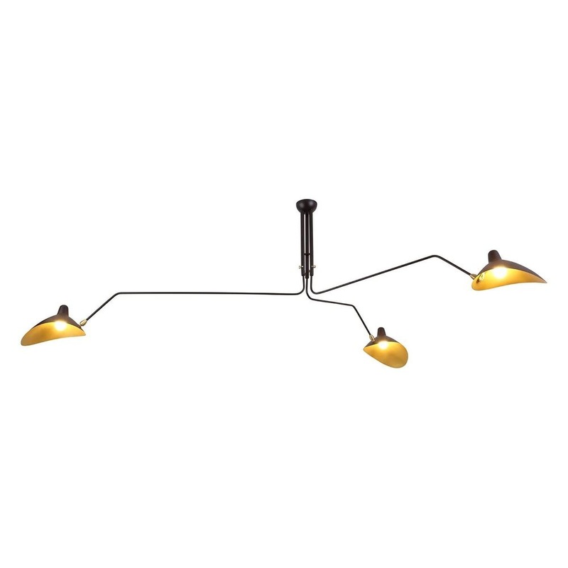 An impressive design inspired by mid-century designer Serge Mouille’s 1958 series, this three-arm lamp creates a dramatic and sculptural feel with its unique shapes and angles. The chandelier features a central vertical stem with three curved arms of different lengths, each adorned with swivel, rotate, and tilt chapeau-style shades for optimal lighting.