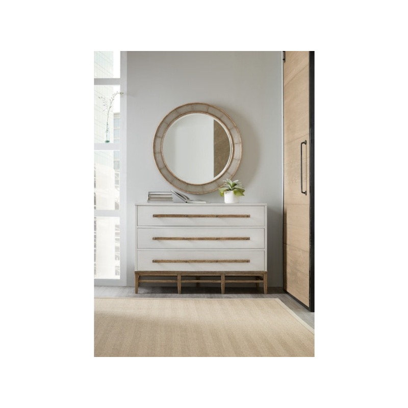 The white plaster finish offers a striking contrast with the Maple base and Maple hardware with rustic bolts for a rustic luxe focal point in your home. Three drawers, with the top two drawers offering 2 removable dividers and the bottom drawer offering one removable divider that is cedar-lined. Crafted of Maple, White Oak and Cedar Veneers with a Solid-Wood Edge top. From farm-to-dcor looks to rustic luxe, AMERICAN LIFE evokes a sense of community, easy living and authentic craftsmanship. Urban Elevation is a rustic luxe collection that will appeal to sophisticated professionals who want to capture the serenity of hometown charm and tranquil atmospheres wherever they live. In a smaller-scale approach, Urban Elevation is crafted of resawn Maple, waxed and luxurious, along with waxed aluminum, small nails and solid maple hardware with exposed bolts. Soft, aluminum-wrapped legs distinguish the dining table, along with metal accents on other pieces. Adding to the serene, light color palette is a white plaster accent finish on several pieces including a chest, host chair and entertainment center, providing a cool contrast with the maple finish and the maple hardware with rustic bolts.