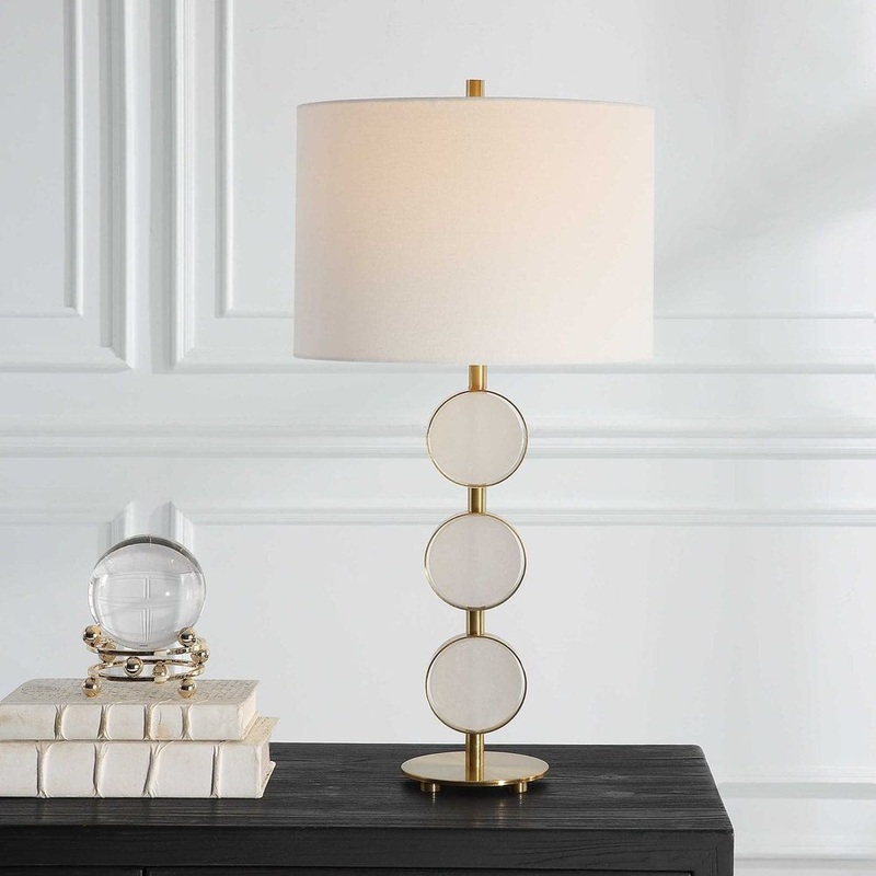This table lamp brings a soft contemporary flair to any room by featuring three suspended alabaster disk surrounded by a sleek metal base finished in a plated brushed brass. The round hardback shade is covered in a crisp white linen fabric.