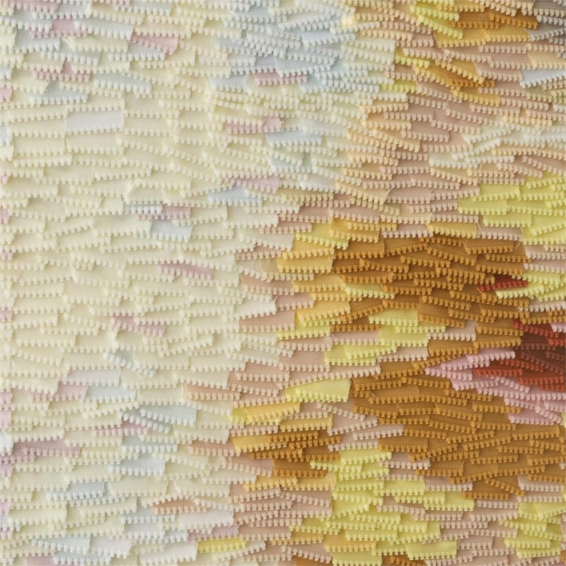 Through the Veil by artist Tony Fey is a striking dimensional work that brings a captivating sense of depth to an interior. Composed of hundreds of serrated composite pieces, each element is hand-placed to form an abstract image of a human figure peering through a vibrant, layered veil. The artwork is showcased within a clear acrylic box frame.