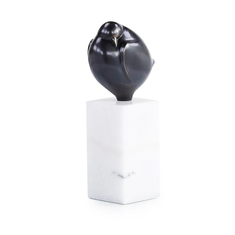 The Timeless Flight Sculpture is a whimsical home accent that depicts a small bird with smoothed features. The bird, crafted from aluminum, displays a stylish bronze finish and rests atop a white marble base.